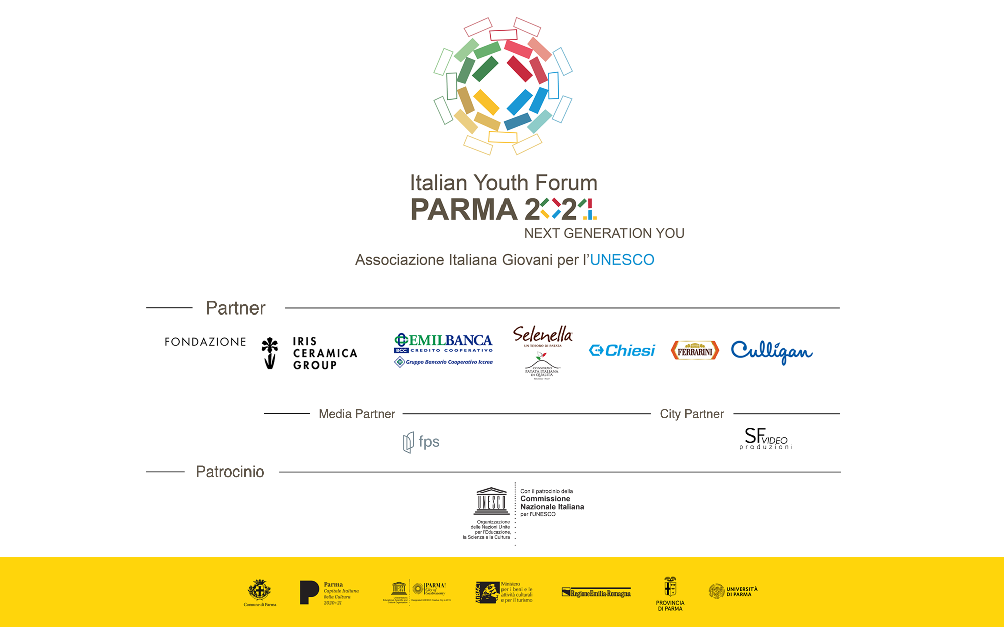L’Italian Youth Forum Parma 2021 Next Generation You si svolgerà il 27 Marzo 2021 in diretta streaming da Parma, Città creativa per la gastronomia UNESCO e Capitale italiana della cultura 2020+2021, e punta a raggiungere e coinvolgere una platea ancor più vasta di giovani che potranno arricchirsi di idee e proposte da portare nelle loro comunità. L’evento è patrocinato da: Commissione Nazionale Italiana per l’UNESCO, Regione Emilia-Romagna e Università degli Studi di Parma. In collaborazione con Parma Capitale Italiana della cultura italiana 2020+21, Parma città creativa UNESCO della gastronomia.