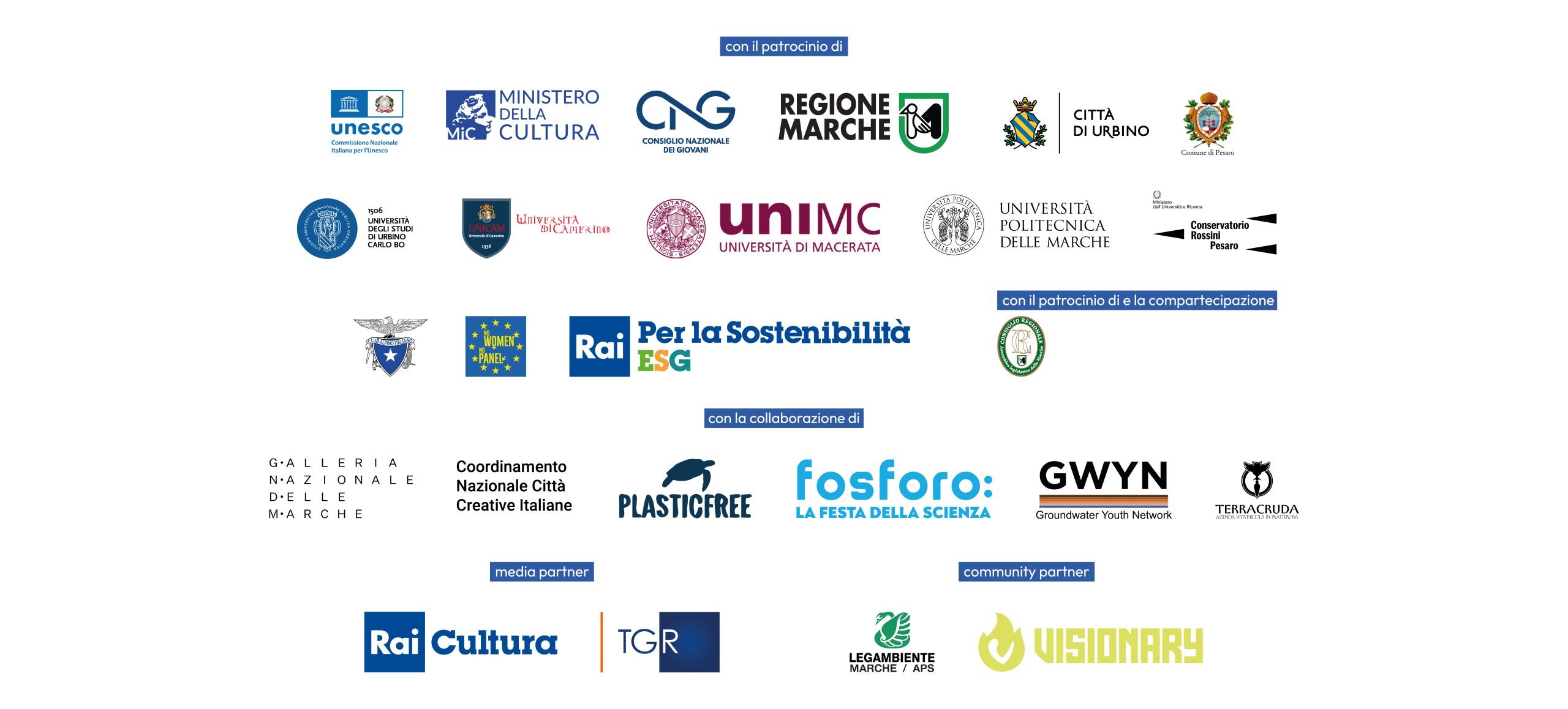 L’Italian Youth Forum ad oggi ha ricevuto il patrocinio della Commissione Nazionale Italiana per l’UNESCO, Regione Marche, Città di Urbino, Comune di Pesaro, Ministero della Cultura, Consiglio Nazionale Giovani, Università degli Studi di Urbino “Carlo Bo”, Università di Camerino, Conservatorio Rossini Pesaro, Galleria Nazionale delle Marche e Coordinamento Nazionale Città Creative Italiane.