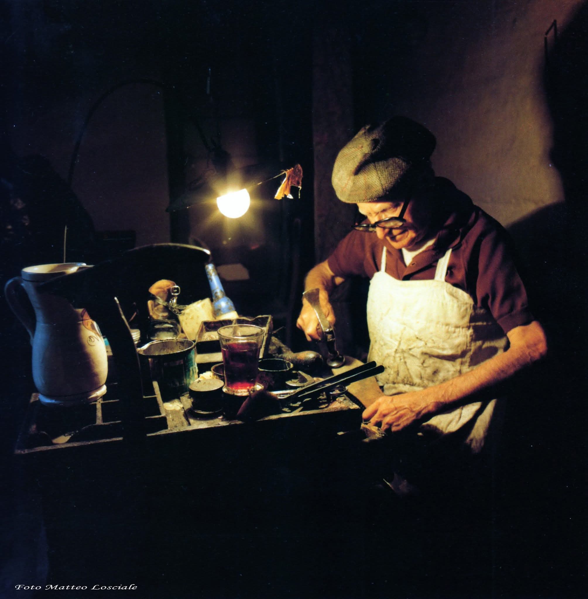 Si occupava con maestria della riparazione delle scarpe: sistemava le cuciture, sostituiva i tacchi consumati e ricuciva con precisione le suole danneggiate. Il lavoro richiedeva abilità, attenzione e una buona conoscenza dei materiali. Nella maggior parte dei casi si cambiava soltanto la mezza suola — quella parte che andava dalla punta fino all’avampiede — realizzata con cuoio animale resistente, tagliato e modellato a mano per adattarsi perfettamente alla forma della scarpa. Ogni intervento restituiva nuova vita alle calzature, prolungandone l’uso e mantenendo viva un’arte antica fatta di gesti precisi e di esperienza tramandata nel tempo.