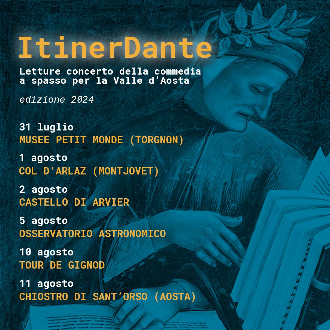 Dato il successo dello scorso anno, anche quest’estate verranno organizzate varie letture-concerto itineranti in luoghi non convenzionali, ricchi di fascino e magia: veri e propri percorsi culturali e musicali, ognuno diverso dall’altro, che prevedono una lettura con declamazione e commento a cura dei soci AIGU della Valle d’Aosta Antonello Pistritto e Jean Louis Crestani, accompagnati dal violoncellista Daniel Curtaz. Leggere Dante a voce alta significa cantarne le parole, portatrici di una musicalità propria, e il violoncello, il cui timbro si avvicina alla voce umana maschile, è lo strumento perfetto per esaltarne l’essenza. Le Letture, della durata di circa un’ora e mezza ciascuna, sono ad ingresso gratuito.