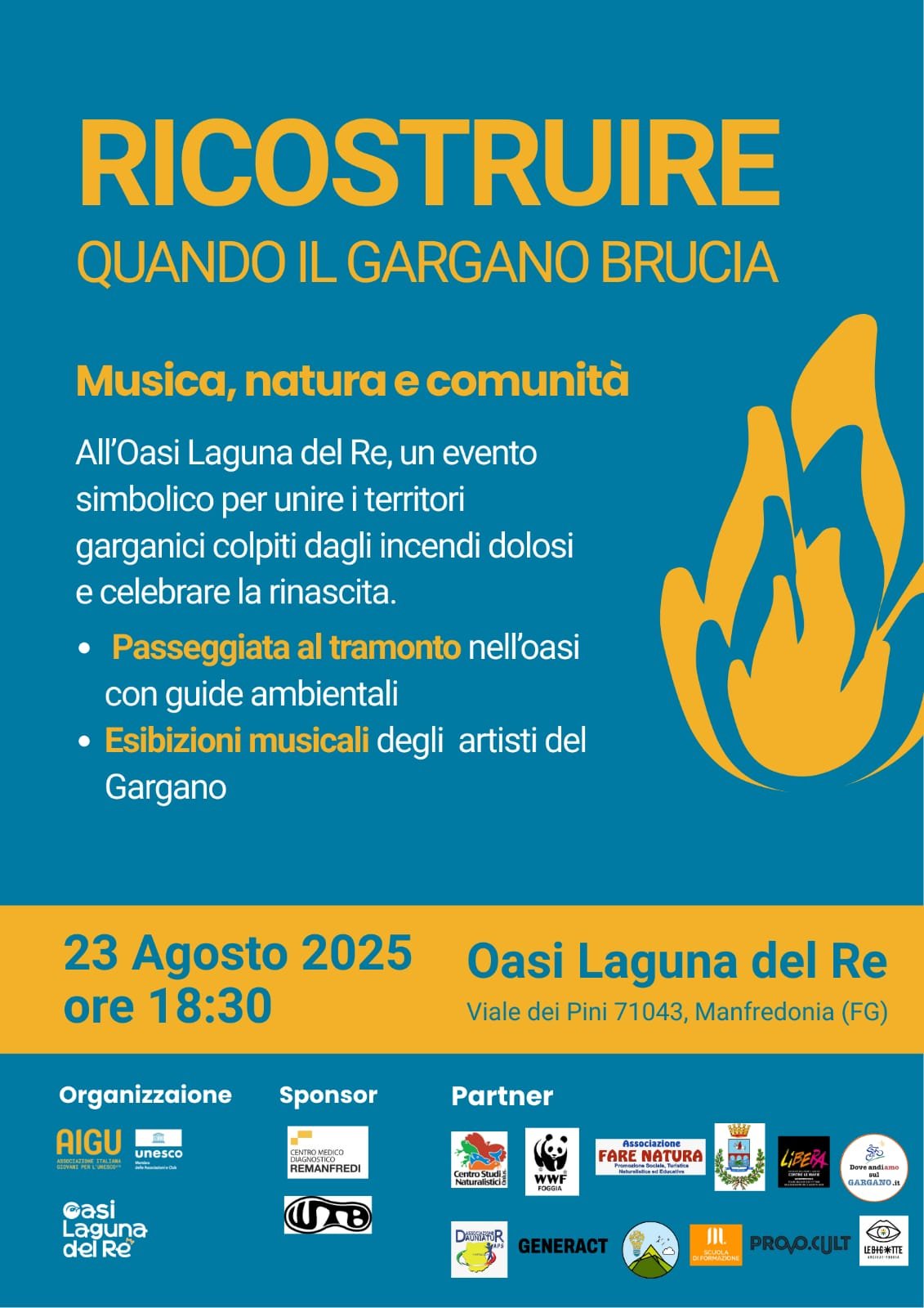 Il Gargano, come ogni anno, è stato colpito da incendi devastanti che hanno bruciato boschi, campagne e aree naturali protette, lasciando dietro di sé ferite profonde. Per rispondere a questa emergenza e per trasformare la rabbia in speranza, l’Associazione Italiana Giovani per l’UNESCO organizza l’evento “Ricostruire – Quando il Gargano brucia”, in programma sabato 23 agosto 2025 alle ore 18:30 presso l’Oasi Laguna del Re (Viale dei Pini, Manfredonia – FG).